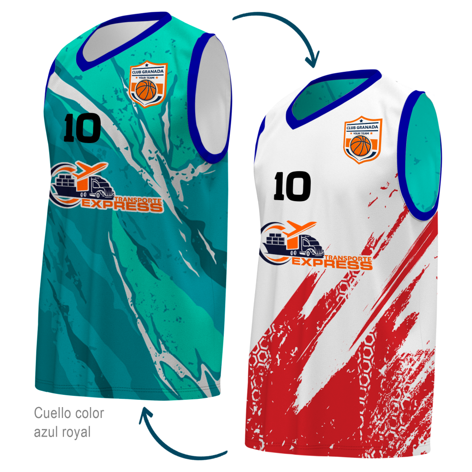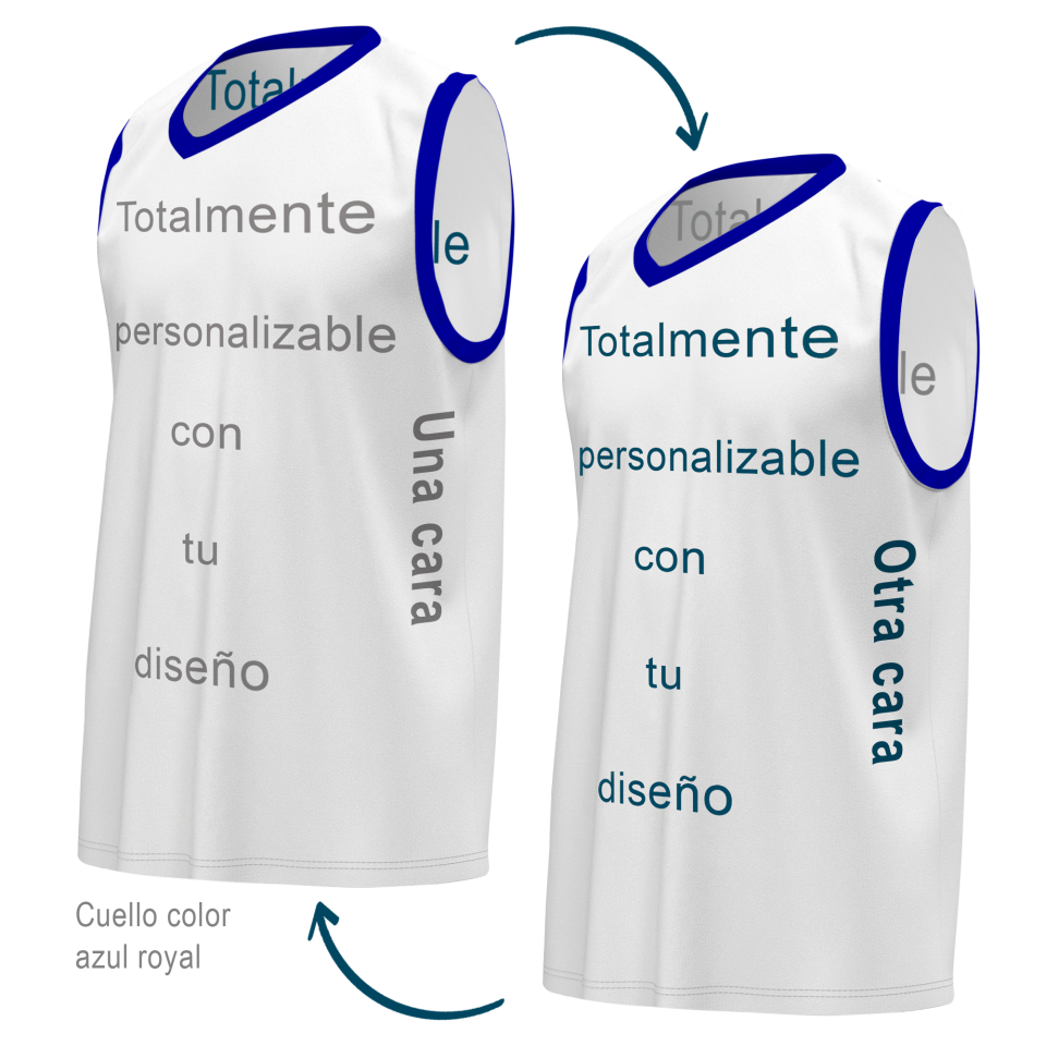 Camiseta reversible ideal para todo tipo de actividades y deportes. Modelo GRECIA sin mangas y con cuello pico contrastado que se puede personalizar al 100% por delante, detrás y cara externa e interna de la camiseta. También puedes escoger el color de cuello y ribete.