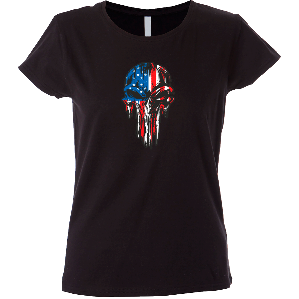 Camiseta mujer de manga corta con cinta de refuerzo en el cuello con diseño de calavera derretida USA