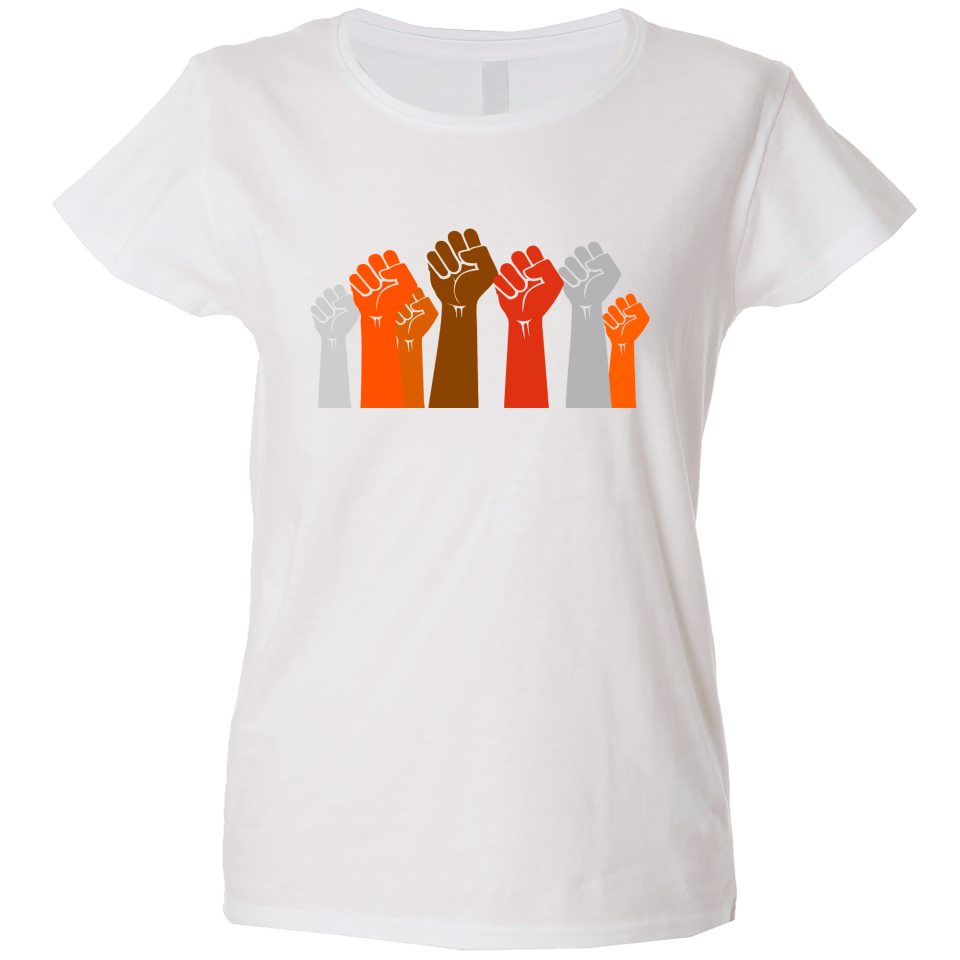 Camiseta mujer de manga corta con cinta de refuerzo en el cuello con diseño de puños feministas