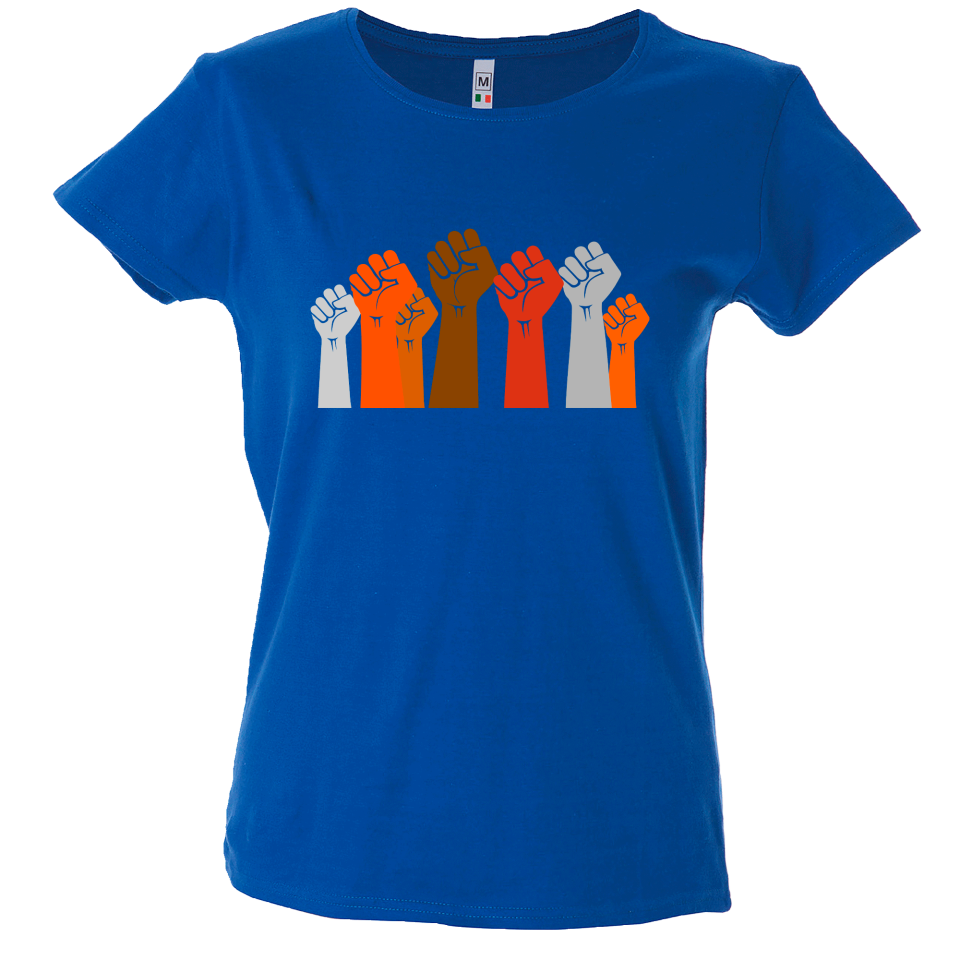 Camiseta mujer de manga corta con cinta de refuerzo en el cuello con diseño de puños feministas