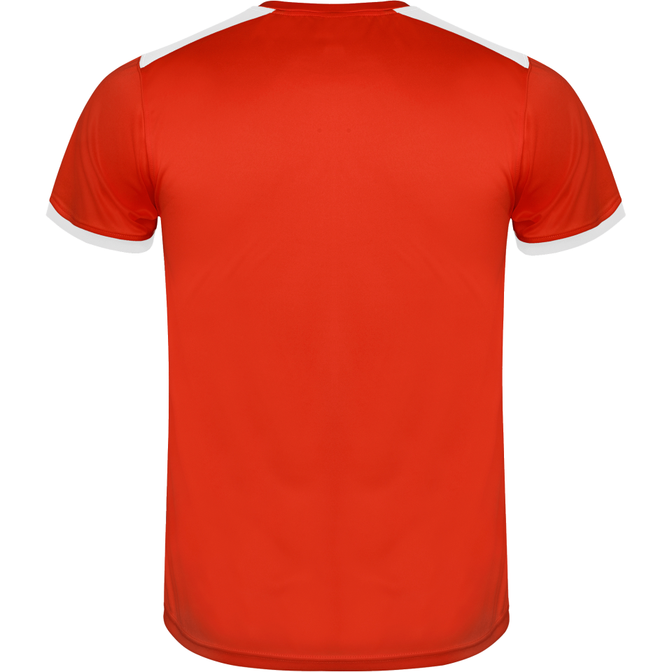 • Cuello redondo con ribete bicolor y con cubrecosturas reforzado en su interior