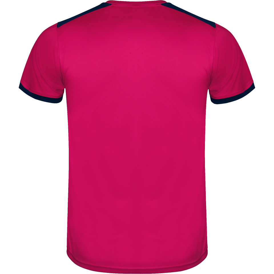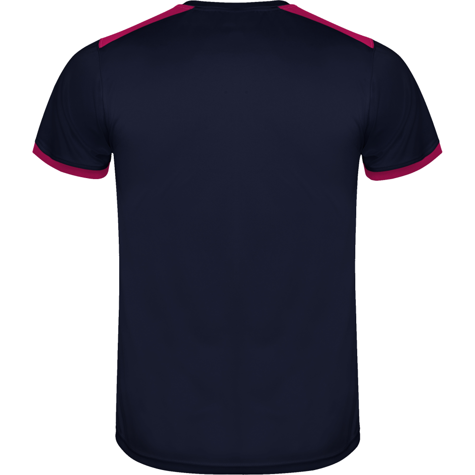 • Cuello redondo con ribete bicolor y con cubrecosturas reforzado en su interior
