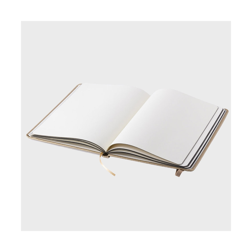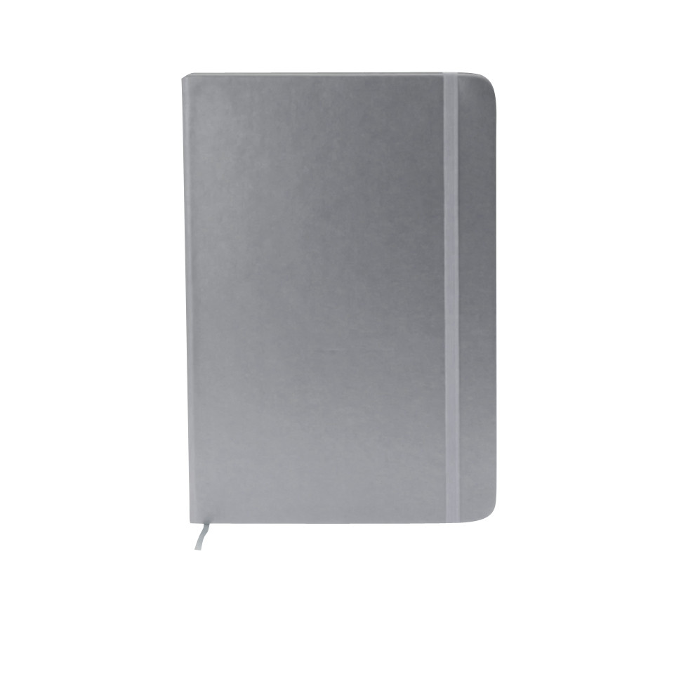 Libreta de hoja blanca con tapas en polipiel de colores metalizados. 80 páginas de hoja lisa de color natural, con elástico de sujeción y marcapáginas de tela a juego.
