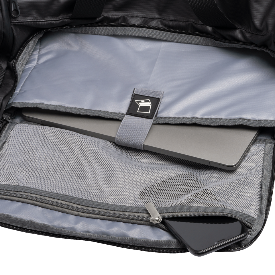 Compartimento principal y un bolsillo acolchado, además, múltiples bolsillos exteriores. También incluye un compartimento especial para calzado.