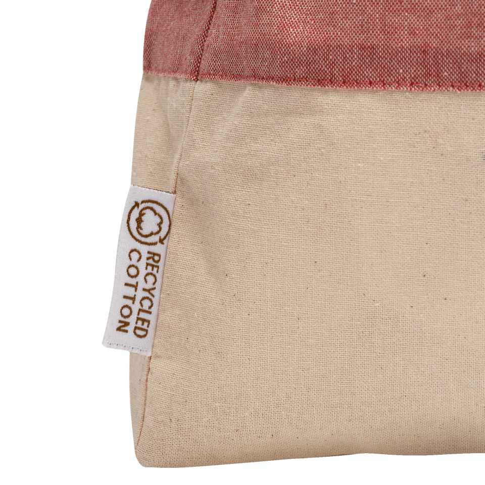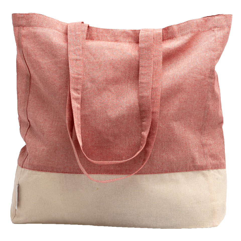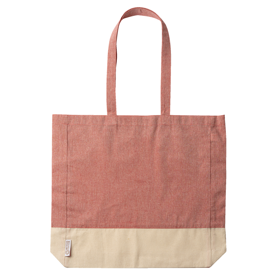 Bolsa bicolor de algodón reciclado con acabado jaspeado y en la parte inferior de algodón natural. Cuenta con asas largas reforzadas de 70 cm