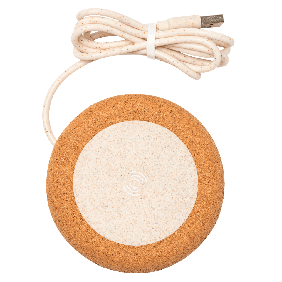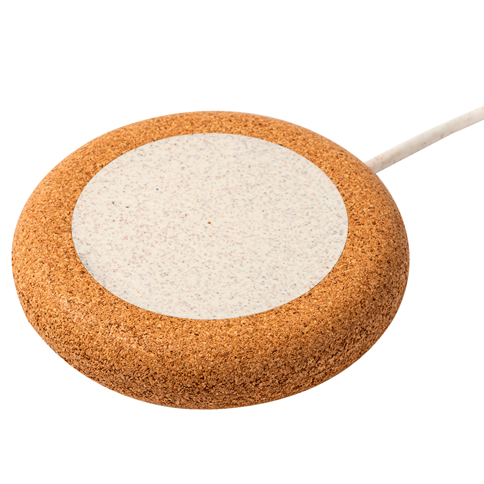 Cargador inalámbrico con cuerpo de corcho natural y fibra de trigo.