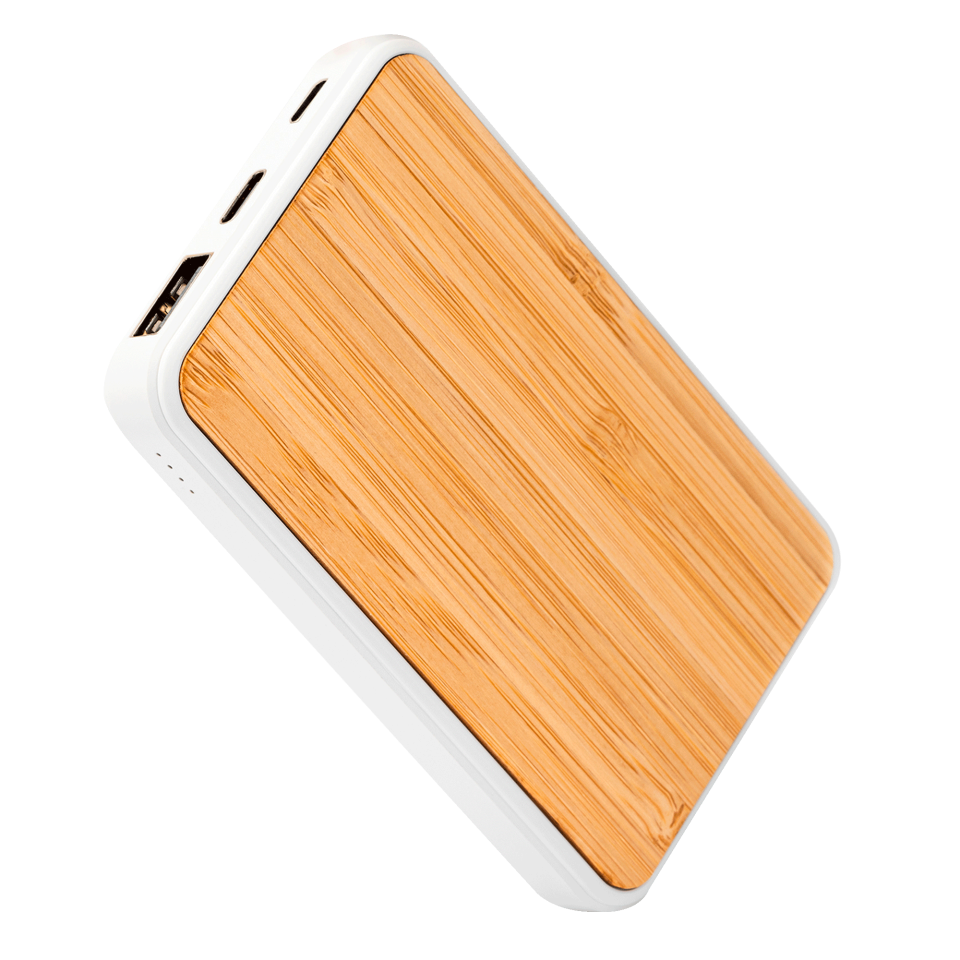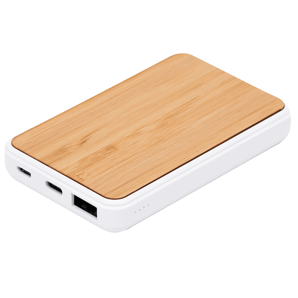 Batería externa de 5000 mAh con cuerpo rectangular de ABS blanco y superficie de bambú
