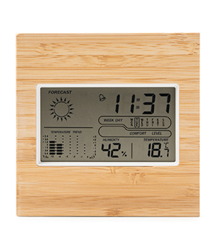 Estación meteorológica con carcasa frontal de bambú.