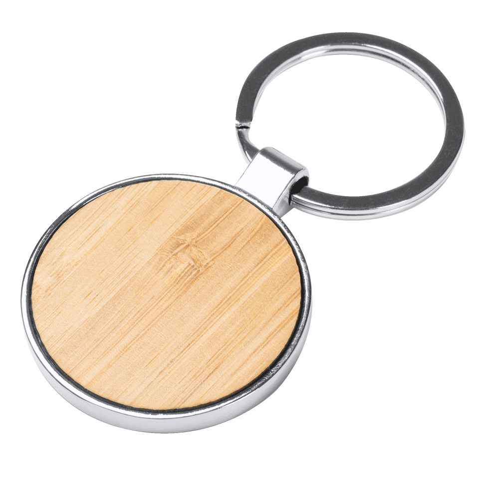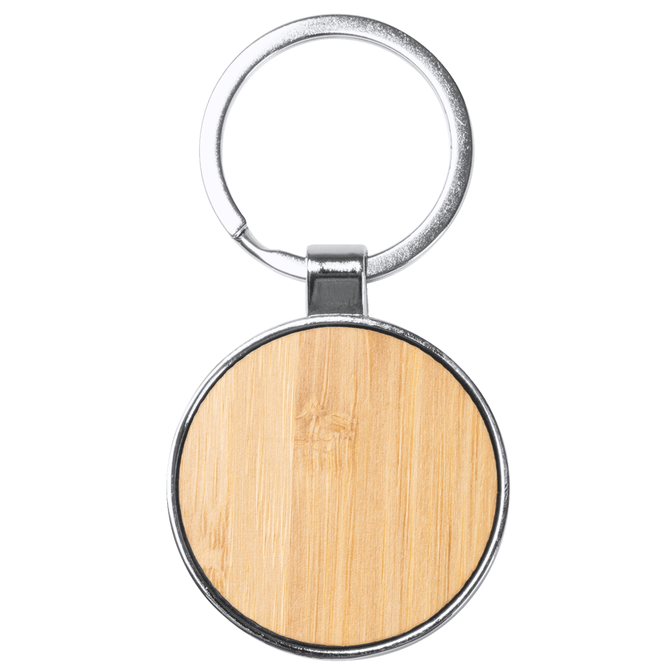 Llavero con diseño redondo elaborado en bambú con acabado metálico