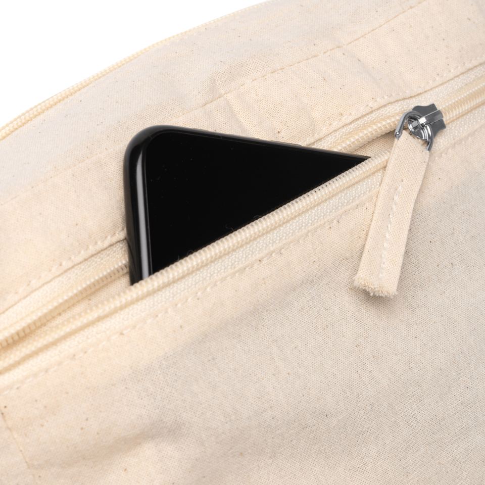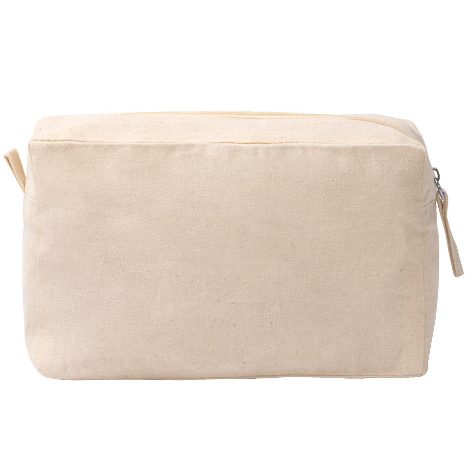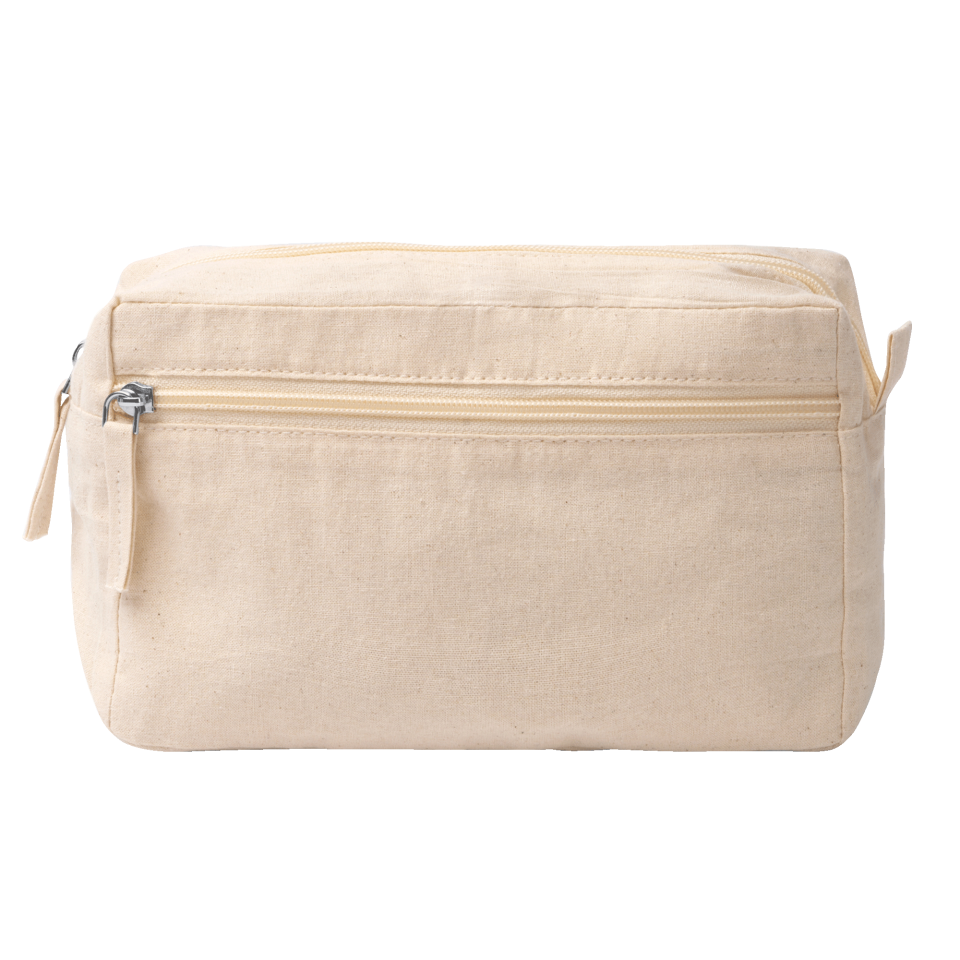 Neceser 100% algodón con un gramaje de 150 g/m2. Tiene doble bolsillo (principal y lateral) con cierre de cremallera