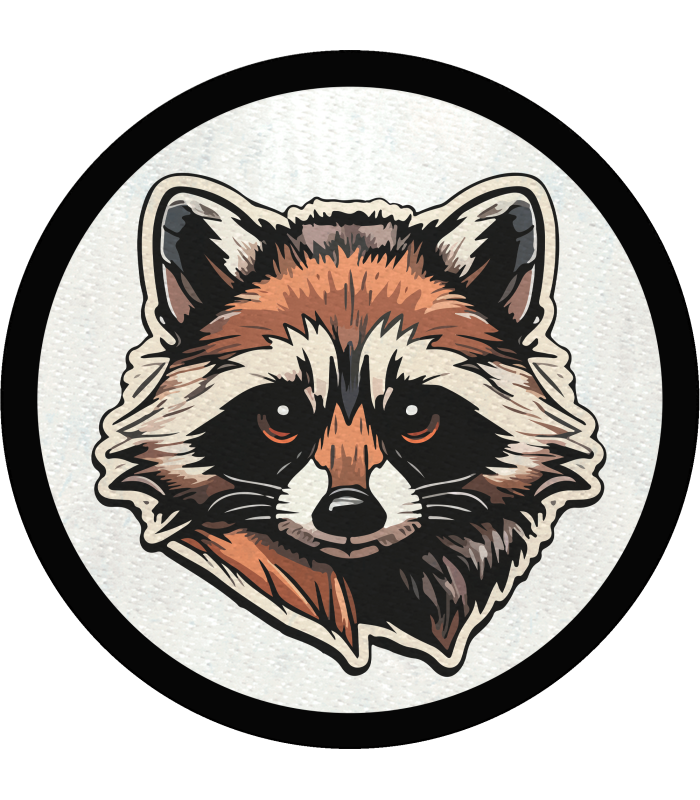 Parche stick DTF Eco flock negro con diseño de procyon lotor.