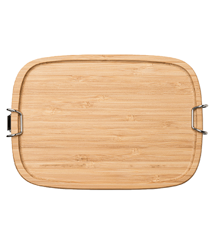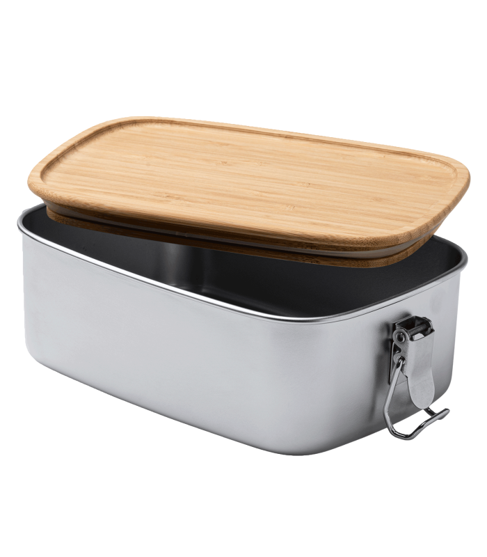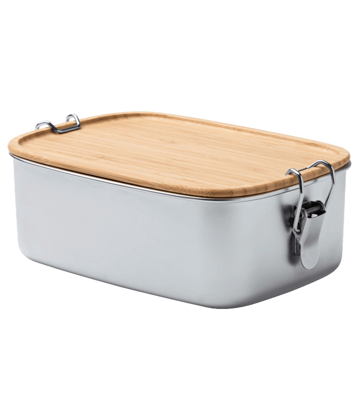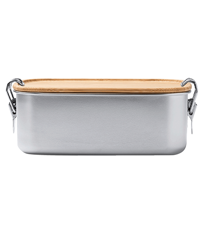 Fiambrera de acero inoxidable 304 con tapa de bambú. Sistema de cierre mediante hebillas laterales.